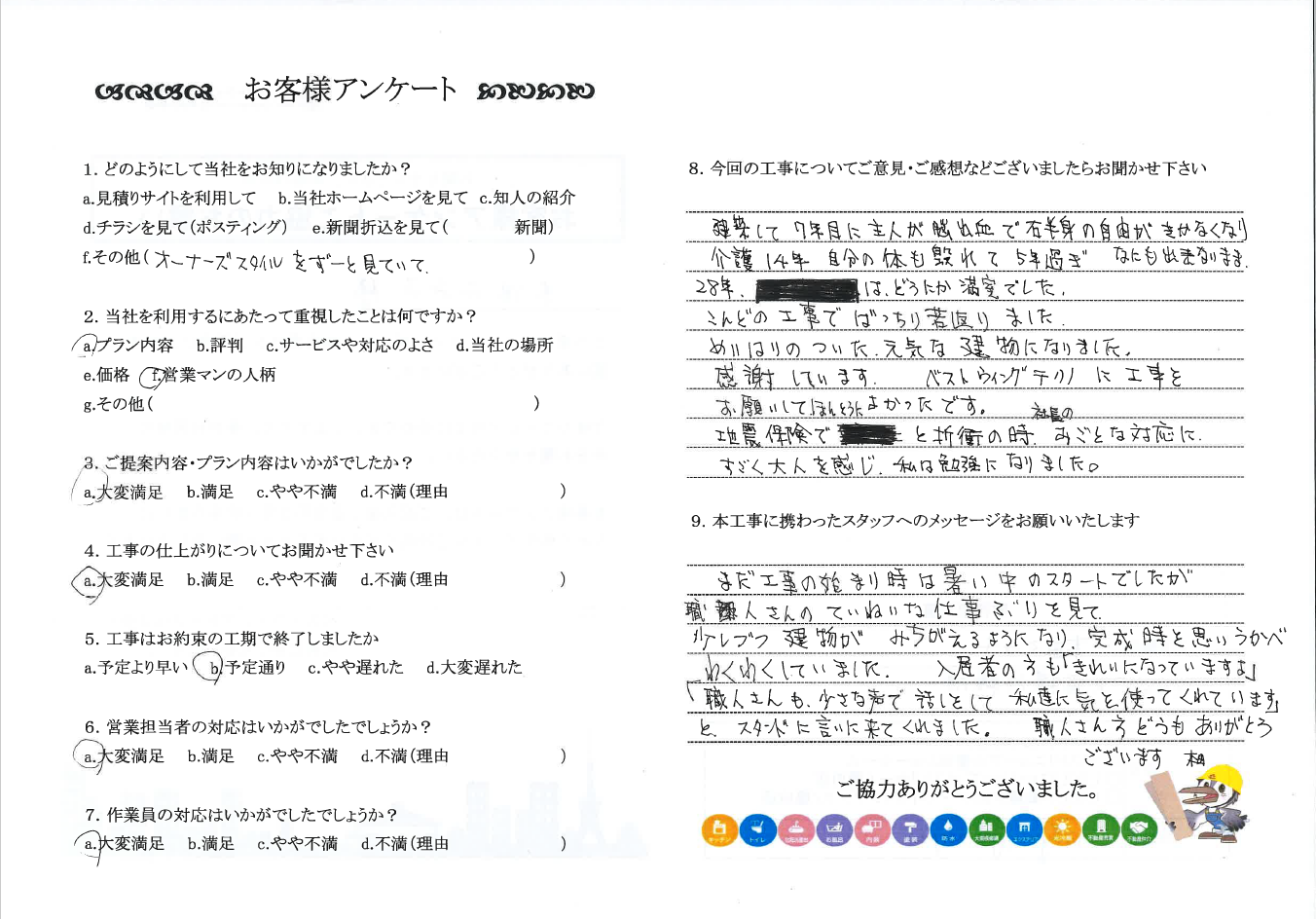 建築して7年目に主人が脳出血で右半身の自由が利かなくなり介護14年、自分の体も痺れて5年が過ぎなにも出来ないまま、28年、管理物件はどうにか満室でした。今度の工事でばっちり若返りました。メリハリのついた元気な建物になりました。感謝しています。ベストウイングテクノ株式会社に工事をお願いして本当に良かったです。地震保険でT社と折衛の時みごとな対応にすごく大人を感じ、私は勉強になりました。