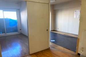 4DKだったこちらの間取り。ダイニング横の洋室の壁をなくし、広々とした一つの空間にいたしました。